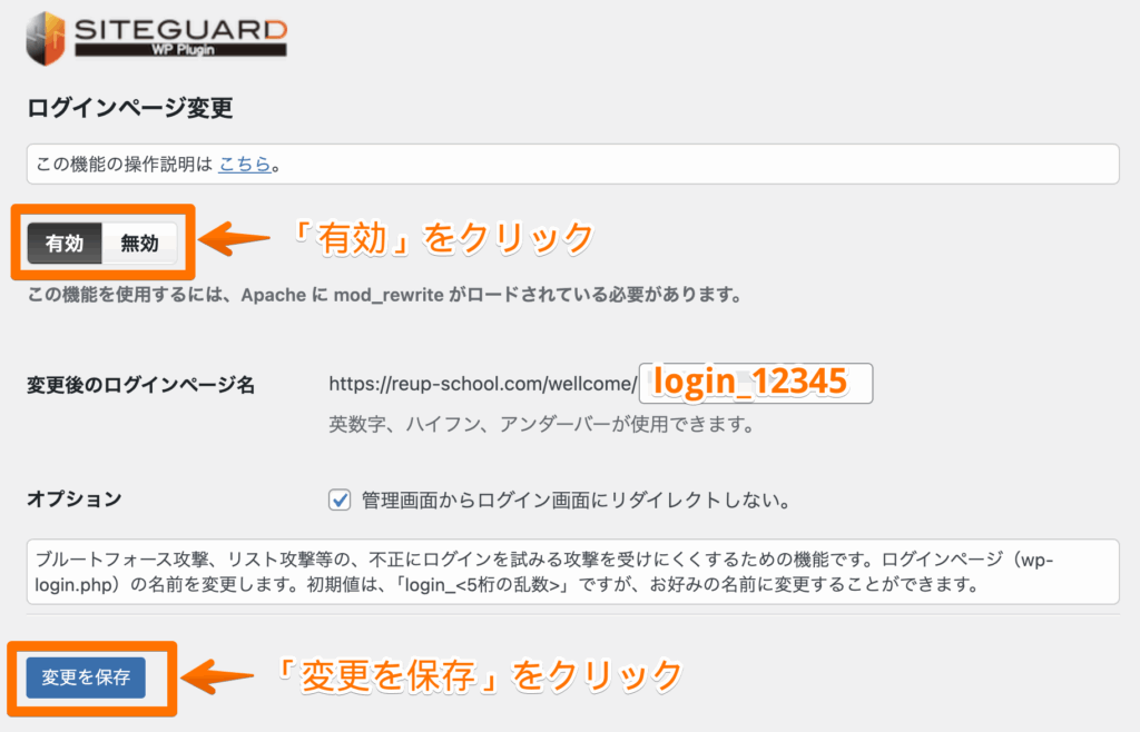 SiteGuardを有効化すると、自動的にログインURLが変更されます。